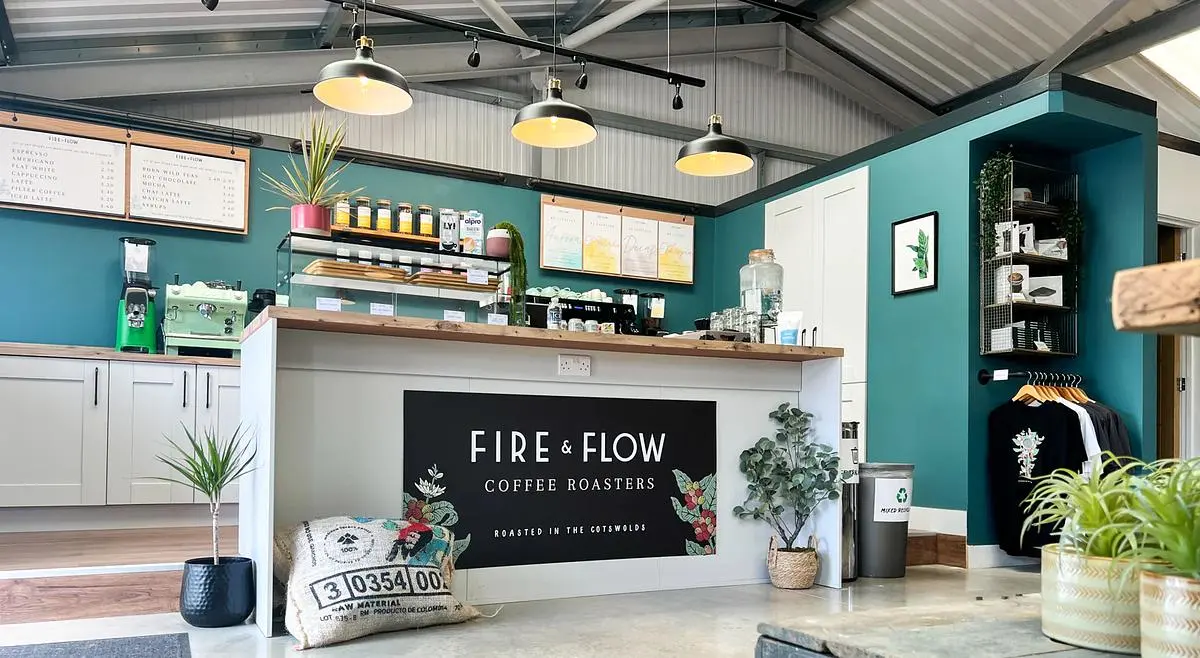Fire and Flow Roastery in Cirencester, United Kingdom is a specialty coffee stop on the Caffe Atlas map. Expect espresso, filter coffee, decaf coffee, plant-based milk. Food options include breakfast, lunch. Practical details include free wi-fi, laptop friendly, kids friendly, vegan options.